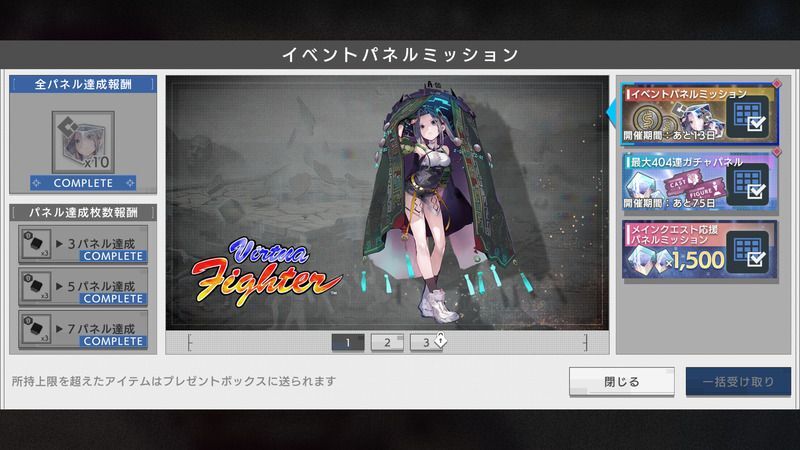 | 全パネル(1枚目)達成 | [カソード]バーチャファイターのピース×10 |