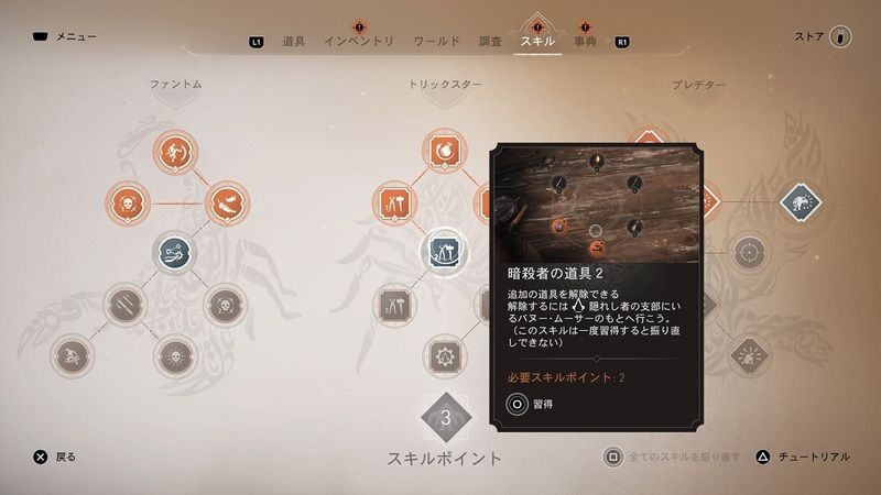 - スキル系統「トリックスター」にてスキルポイント2で新たに道具を1つ解放できます