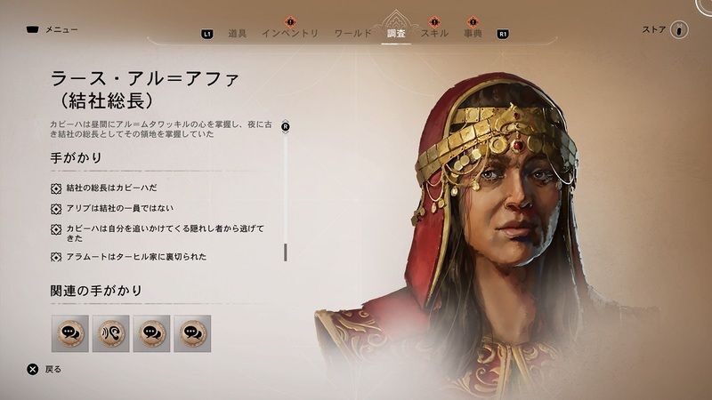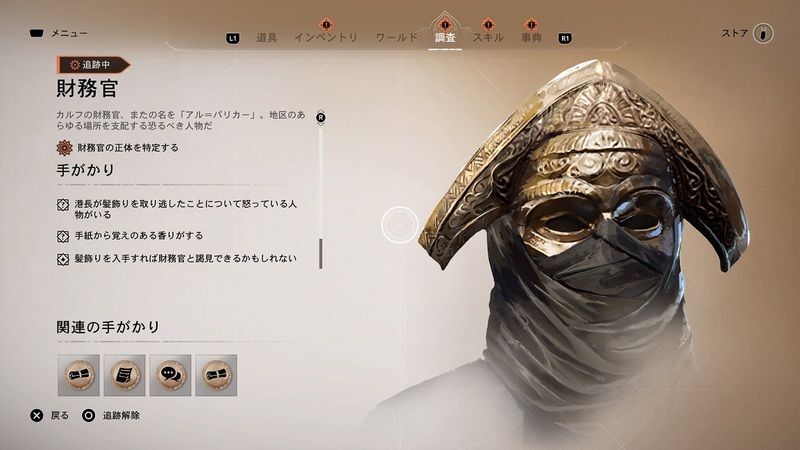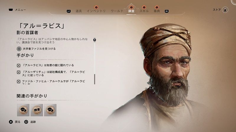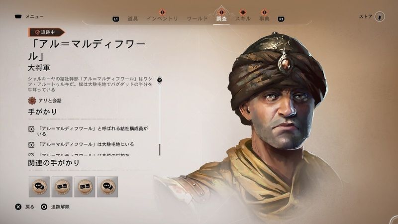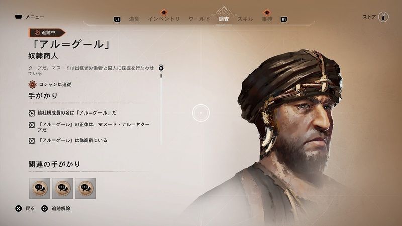 - 本作アサシンクリードミラージュに登場する敵組織(古き結社)構成員は古代三部作とは異なりメインシナリオを進める上で必ず全員暗殺する事になる為、手掛かりを元に探すと言うよりは調査を進める事で自然と判明していきます