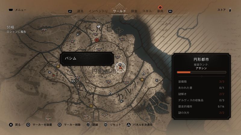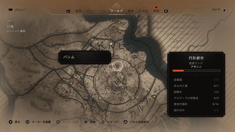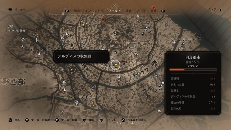 アサシンクリードミラージュのエリアMAP「円形都市」に存在する収集品ガイドになります。各収集品の取得の参考にご覧ください。