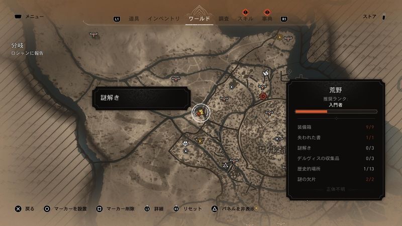 | 画面表示では荒野の失われた書は「1」ですが、実際には地図にマークされない隠しのこの書を入れて計7冊となります | |