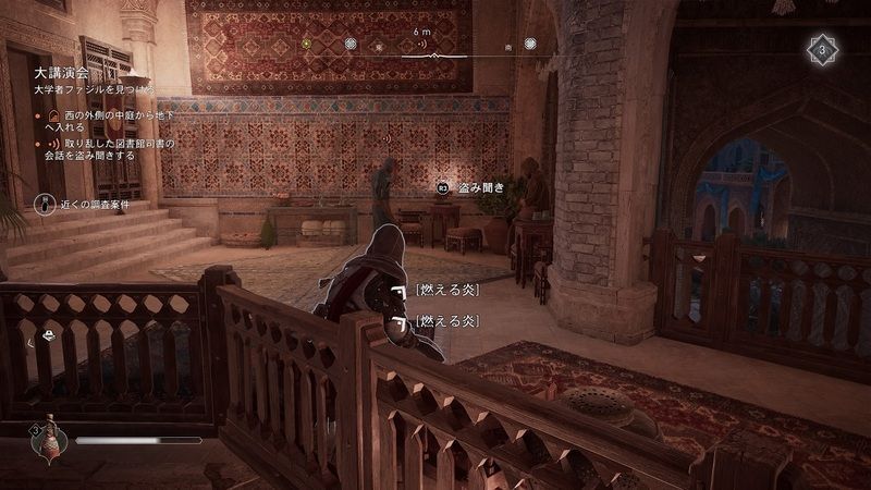 ![]() 図書館司書がファジルの書物を探している 会話していた2人の後を追い先に進む 階段で本を発見 天文学の書物から警備された部屋への合言葉 が手に入る 先に進み手紙を調べる 書物は図書館北西側のバルコニーにある ![]() | |