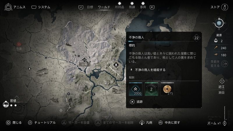 このクエスト中は「竹生島」にいる事は確認できましたが、これを終えている場合他の場所にいるのかまでは未確認です。
