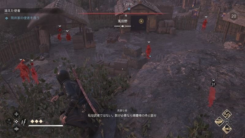 | ・宇陀松山城へ向かう ・南側の壁が壊れているらしい ・目標付近に「夜鷹組」秋山の密偵がいる ・余裕があれば倒しておこう ![]() ・「繰り返される運命」(至高の鉄砲)入手 ・「離れた敵へのダメージ」(至高の彫刻)入手 ・「忠実なる友へ」(クエストアイテム)入手 夜鷹組「託宣者」の居場所がわかる ![]() ・「和議への正体の書状」(クエストアイテム)入手 | |