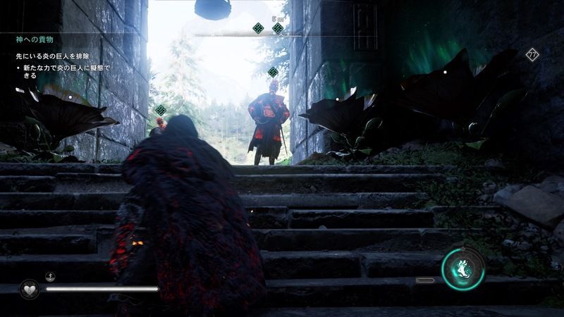![]() 《ムスペルヘイムの力》 溶岩・火・爆発によるダメージを一切受けなくなる 巨人に擬態して敵を欺く事ができる 混乱を招く行動をとると、擬態がバレてしまうので注意 「力」の使用はR2を押しながら十字キーの左右で選択 発動後、ゲージが無くなると効果終了 | |