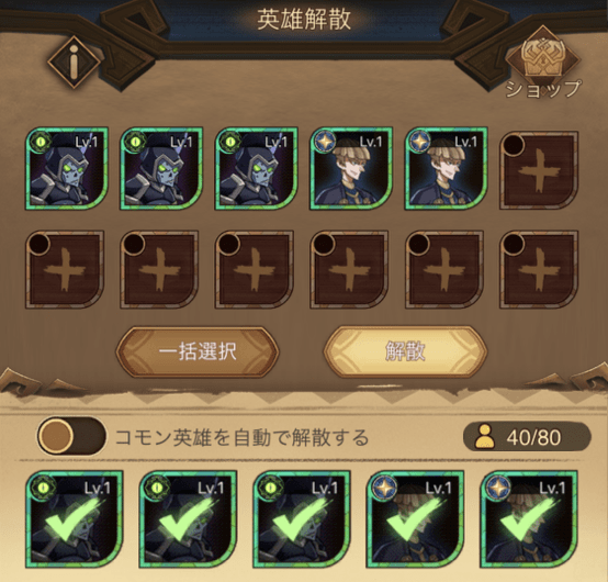 コモンレアのキャラは被りやすく、英雄のスロットを圧迫することにもなるので、ある程度集めったら定期的に解散させるようにしましょう。