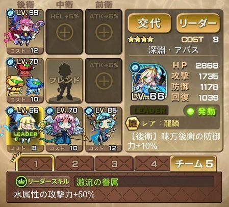 | 【リーダー】深淵・阿珀絲(日本版:深淵・アパス) リーダースキル:水属性の攻撃力+50% (攻撃力を上げないと1戦目、5戦目が長引き事故が増える) ・禍之啼哭・化蛇(日本版:禍の泣・化蛇) (「毒状態」「失血状態」で属性に左右されないダメージを与える) ・他3体 【フレンド】巴哈姆特(日本版:バハムート) リーダースキル:水属性などの、HP+15%、攻撃力+40% (水属性強化のキャラであれば良い、※スキル未使用) |