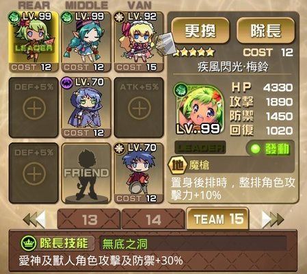 | 【リーダー】疾風閃光・梅鈴(電光石火・マリン) リーダースキル:種族愛神などの、攻撃力および防御力+30% (進化前でも同じリーダースキル。他は、ルゥ、ディル×兄貴) ・莎姫(セージィ) (回復役その1。「弱化状態」解除可能) ・攻略完成!林詩(愛神・ラム) (回復役その2。スキルを使うのは主にラム) ・拉杜(ラトー) (超愛神対抗で道中楽) ・愛神・娜芬蒂兒(キューピッド・ラベンダ) (【全体】攻撃持ち。1ターンだけの「減防状態」スキル。) 【フレンド】莉莉絲・戰鬥VER.(リリス・戦闘VER.) リーダースキル:攻撃力+35%、HPおよび減傷+12% (全キャラ強化できればいい) |