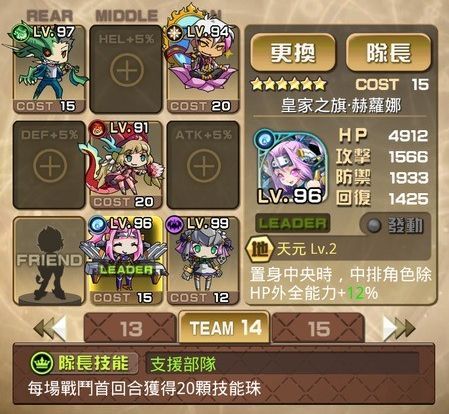 | 【リーダー】 ・皇家之旗・赫蘿娜(日本版:暴撃改造ユナ) (特別クエストで唯一入手できる、戦闘開始時スキル玉獲得キャラ) ・佛帝・如来(日本版:仏帝・如来) (うまくやればアイテム不要。Charge後スキルで約15万ダメージ) ・炎天聖・諸葛孔明(日本版:※同じ) (2ターンかかるが如来と同じダメージ)・鋼鐵女僕・可露可(日本版:アイアンメイド・コルコ) (自爆をフルに使用。今回は属性相性良し) ・他1体は、木属性で足止めキャラor須佐之男(日本版:スサノオ) 今回コルコの相性が良いので、ボスのHPが60万ぐらいまでならボスに攻撃される前に倒せる。90万はクエスト1回で削り切れるが、95万以上は道中・ボスの行動次第。 【フレンド】5属性強化キャラを選ぼう。 |