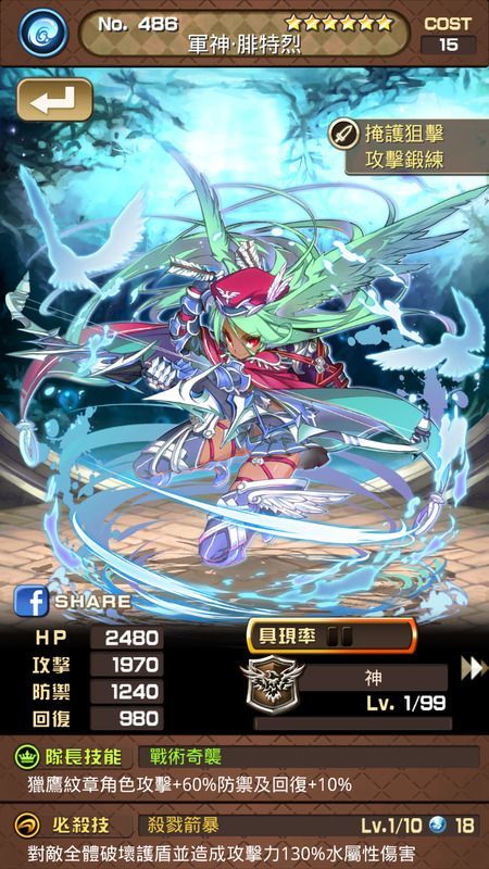 | 帝王之鷹・腓特烈(鷹の帝王・フレデリック)と違い、色黒な猟鷹の紋章王。 リーダースキルは極めて使いずらいものの強力。猟鷹紋章のキャラは、各紋章で一番高い攻撃力を持つ。また、高い防御力を上げながら「シールド」やスキルでの回復量が増えるため、生存力も上昇する。ただし長時間耐えるのは出来ないキャラが集まっているため、「制限状態」に出来るキャラも用意しておこう。ただし、蒼色外神・幻蒂卡(蒼色外神・バンダーカ)がいればほとんどの問題を一人で解決してくれる。 スキルは、【全体】攻撃+護盾破壊というもの。敵が【全員】に「シールド」を展開するという場面は非常に稀。紋章王らしからぬ軽いスキルコストを活かし、バンバン使っていく方が正しいだろう。 進化すると、魔法少女っぽくなる。また、スキルが【全体】攻撃+【全員】「シールド」+「クリティカル率アップ」に変わる(必要SPは増える)。使いやすくなるのだが、凶キャラである蒼色外神・幻蒂卡(蒼色外神・バンダーカ)との相性がすこぶる悪い。手持ちのキャラ次第では図鑑を埋めるためだけの進化と考えたほうが良い。 ※編集中 キャラ評価をコメント欄までお願いします |