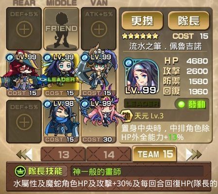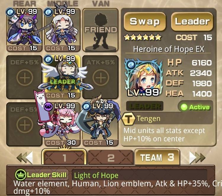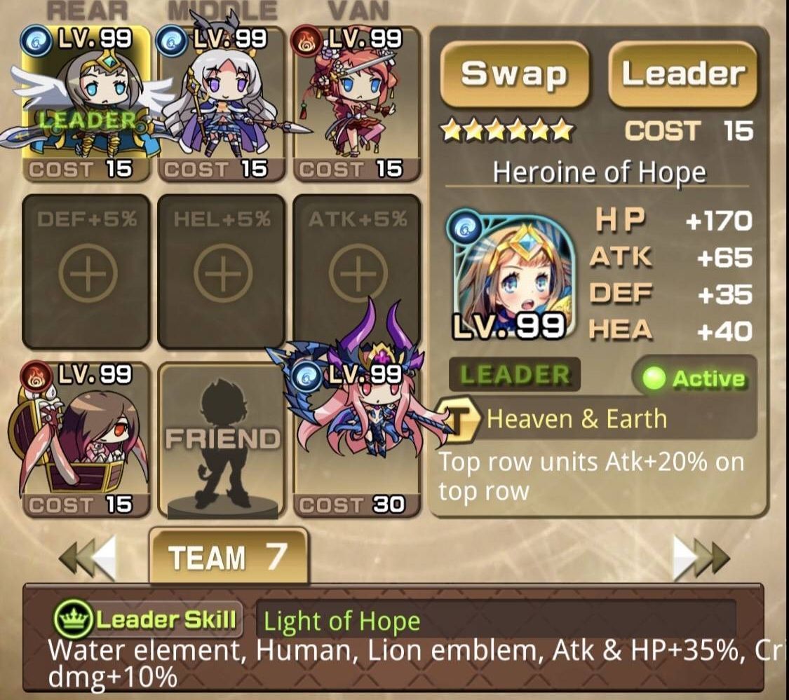 | 【簡易解説】 【リーダー】希望之勇者(希望の勇者) リーダースキル:獅子紋章などの、HPおよび攻撃力+35%、クリティカルダメージ+10% (アタッカー+リーダー) ・◯神之主・奧丁EX(主神・オーディンEX) (「減攻状態」+「出血状態」) ・鬥聖・詩◯莉EX(闘聖・スカーレットEX) (スキル重ねがけで前衛キャラに。EXで3回、EX前だと唯一効果なので注意) ・冥府姫・泊瑟芬(冥府の姫・ペルセポネ多分SP) (増援の爆弾は一撃で倒せる) 冒險者殺手・寶箱怪(ハンター・ミミック) (アビリティで宝箱を一撃。宝箱を倒すまでは必須) 【フレンド】希望之勇者(希望の勇者) リーダースキル:獅子紋章などの、HPおよび攻撃力+35%、クリティカルダメージ+10% (リーダーと同じ。人気のあるキャラなのでEX進化済みの場合も多い) |