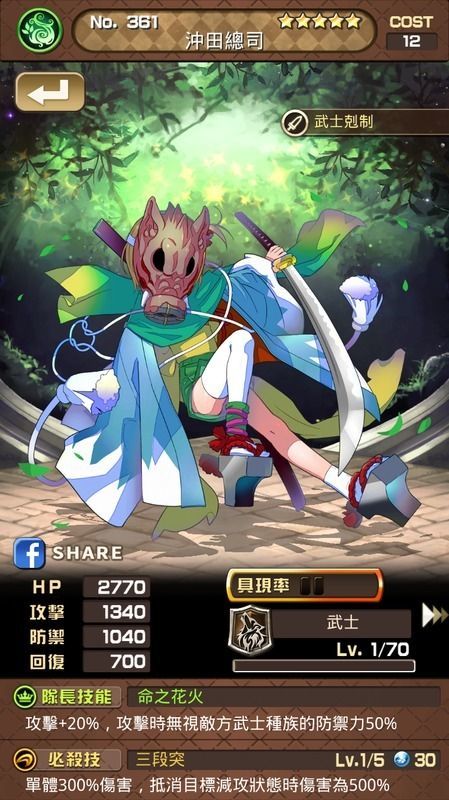 | 『花丸なイケメン男子達の日常を描くアニメ』の第1期の主役『大和守安定(やまとのかみやすさだ)』を所持していた『新選組』の志士の一人。 猪のような面を被ったキャラだが、進化すると大変愛らしい素顔があらわになる。 イラストは『Kai』氏。 ★6木属性種族武士で常時入手できる唯一のキャラ。であるためか、能力値はいまいち(C.Vも無いので更に困る)。「減攻状態」に出来る木属性は、「エメラルドゾーン」光翠羽飛のみ(ただしこの問題は、EX進化で解決する)。 EX進化は非常に楽。 |