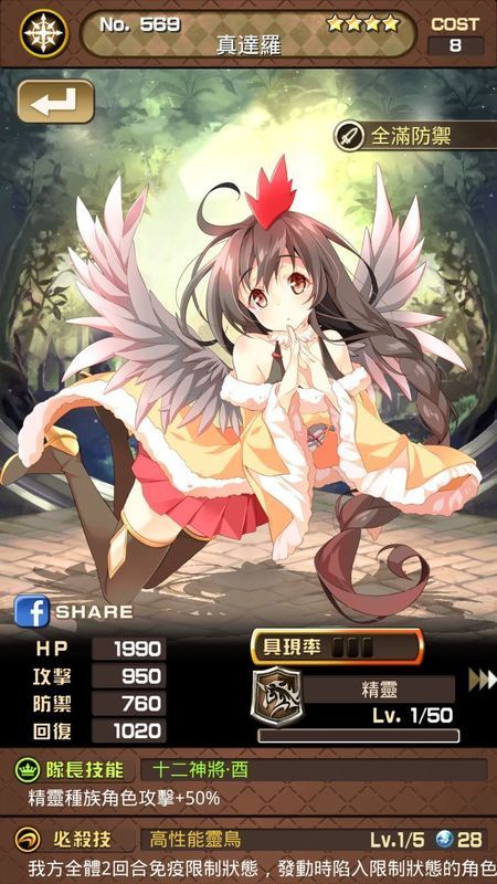 | 十二神将『真達羅(シンドゥーラ、マダラ、シンダラ)』大将、『神道』において、薬師寺如来の世界とそれを進行する人々を守る。人々の願いを叶え、満ち足りた環境に導く。文献により、どの『本地仏(仏教での姿=~菩薩という名前)』が当てはまるのか、どの『時刻(子の時など)』に当てはまるのかは様々である。 参考:新薬師寺(URL:http://www.shinyakushiji.or.jp/junisinsho/)ほか トサカの生えた女の子。ふわっとした感じの可愛らしい娘さんだが、物忘れの多い鳥頭である。「干支シリーズ」のガチャのキャラは、だいたいどう使えば良いか分かりやすいが、シンドゥーラは例外的に扱いに困る。 Ability制限耐性が無いが、「制限耐性」を付与したり、「制限状態」のキャラのHPを回復するスキルを持つ。達貢(ダゴン)のスキル使用で【全員】「禁足状態」にした後にスキルを使えば、非常に低コストでHP全回復ができる。ただ他の「制限状態」に対しては、解除ではなく防ぐように使っていこう。聖女・貞德A(聖女・ジャンヌA)のスキルでも同じことが可能ではあるが、タイミングが極めてシビアで慣れが必要。ジャンヌが旗を振り上げる瞬間(数フレーム?)にジンダラがスキルを使うと、RESISTと出るがHP回復が可能。早いとRESISTのみで、遅いとスキル使用不可。 実装からすぐにスキルが修正され、スキルの回復量が25%や50%から100%になった。また、「制限状態」に「禁足状態」「技封状態」が追加されたのも実質修正となっている。 |