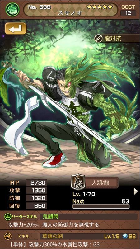 | 『伊弉諾尊(イザナギノミコト)』から生まれた神が『須佐之男命(スサノオノミコト)』。非常に乱暴者である。高天原にいる時にはそれが原因で、『天照大御神(アマテラスオオカミ)』が天岩戸に隠れる原因を作った。生贄にされかけた『櫛名田比売命(クシナダヒメ)』を助けるために『八岐大蛇(ヤマタノオロチ)』と戦い、その結果として『草薙剣』を得た。 『星界之梯as』では龍の賢人に頼まれ『神龍高校』の先生をしている。体育系の先生で、ヤマタノオロチとは仲が悪い(ただし、非があるのは彼女の方)。 敵を選べば極めて強力なアタッカーとなる。非常にレアな種族の組み合わせを持つのでパーティーは組みやすい。リーダースキルとAbilityがかみ合わないが、敵の防御力は固定ダメージや「減防状態」で突破できる。リーダースキルは無視しよう。「愛神レストラン2」BOSS艾斯多拉岡(アイスドラゴン)のアンチキャラで、超弩級30回クリアでは役に立つ。 弗蕾(フレイ)と同じスキルだが、SP進化前のフレイには倍率で勝り、必要SPで負ける。自身の種族も有利な種族も違うため、相手によって使い分けるといいだろう。 |