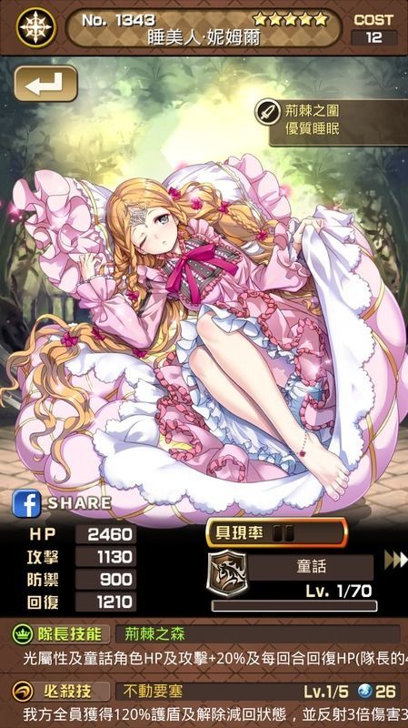 | 光属性、種族童話の、HPおよび攻撃力+20%、毎ターン開始時HP回復(回復量:リーダーの回復力+40%) | ||||