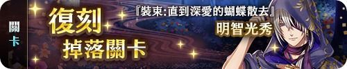 | 1. | 活動期間中,於天之國「寧靜的聚落」會出現《明智光秀掉落》的系列掉落關卡,將有機率出現【裝束:直到深愛的蝴蝶散去】的明智光秀。 ▼進入方法: ① 首頁>繼續旅程>活動情報>【活動】圖示 ② 首頁>繼續旅程>天之國>區域「寧靜的聚落」 ▼《明智光秀掉落》系列關卡: ○ 中級:明智光秀掉落 ○ 上級:明智光秀掉落 ○ 極級:明智光秀掉落 ※需要完成《中級:明智光秀掉落》,才會出現《上級:明智光秀掉落》,以此類推。 |
