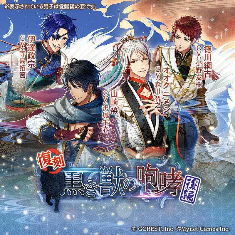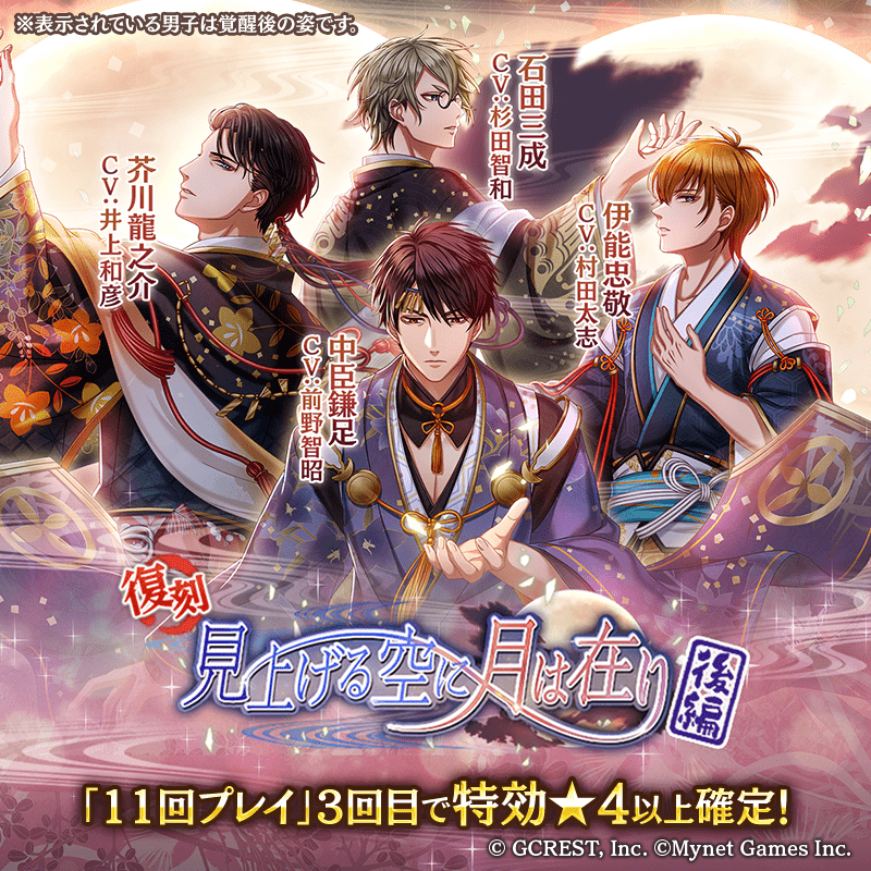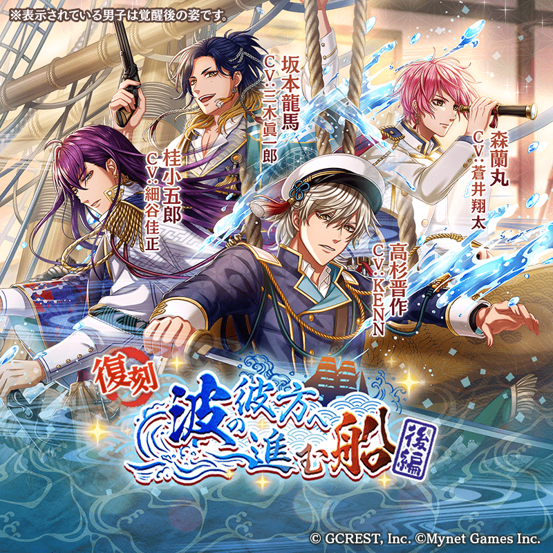 | 04/01・七彩の花待ち★4以上男子確定 04/01・七彩の花待ち★5男子1人確定 04/01・咲き誇る花の誉(徳川家光) 04/03・光属性 04/03・咲き誇る花の誉(安倍晴明) 04/05・[復刻]祝宴の巡り合わせ(SU)第一弾 04/05・咲き誇る花の誉(土方歳三) 04/07・一日一回無料男子 04/08・咲き誇る花の誉(織田信長) 04/10・満ちし月の誘い 04/10・咲き誇る花の誉(高杉晋作) 04/12・[復刻]祝宴の巡り合わせ(SU)第ニ弾 04/12・咲き誇る花の誉(酒呑童子) 04/12・新章公開記念 04/15・咲き誇る花の誉(オロチ) 04/16・春祭り 04/17・咲き誇る花の誉(オオクニヌシ) 04/18・七彩の花待ち(SD) 04/18・まほろばの花盛り 04/19・咲き誇る花の誉(藤原道長) 04/20・★5男子確定無料 04/22・江の国 04/22・咲き誇る花の誉(前田慶次) 04/24・月のきらめき 04/24・[復刻]祝宴の巡り合わせ(SU)第三弾 04/24・咲き誇る花の誉(沖田総司) 04/24・まほろばの花盛り 第二弾 04/26・咲き誇る花の誉(芥川龍之介) 04/27・誕生月(SU) 04/27・[復刻]祝宴の巡り合わせ(SU)第四弾 04/29・咲き誇る花の誉(イナリ) 04/29・咲き誇る花の誉(小野妹子) | |||