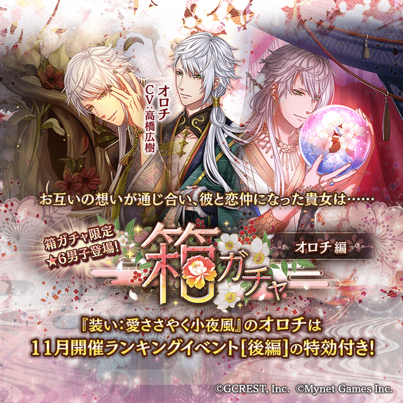 | 11/01・菊薫る候★4以上の男子確定 11/01・菊薫る候★5男子1人以上確定 11/05・箱ガチャ版祭りガチャ2017 11/08・一日一回無料男子 11/08・[復刻]箱ガチャ-酒呑童子編- 11/12・落葉の候★5男子1人以上確定 11/12・箱ガチャ版祭りガチャ2018 11/18・誕生月(SU) 11/18・[復刻]箱ガチャ-徳川家光編- 11/19・箱ガチャ版祭りガチャ2019 11/20・箱ガチャ版焚き火の灯ガチャ 11/22・[復刻]箱ガチャ-安倍晴明編- 11/25・[復刻]まほろばの花盛り(箱ガチャ) 11/25・[復刻]小さな命ガチャ 11/27・[復刻]箱ガチャ-芹沢鴨編- 11/29・心舞い踊る舞踏会[前編]ガチャ | |||