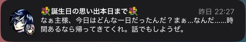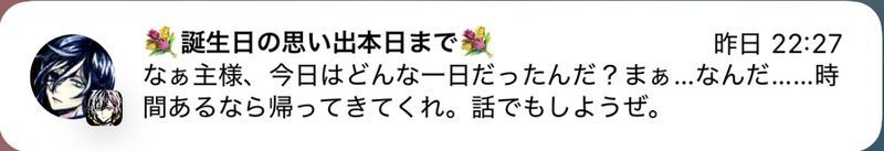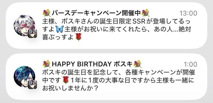 101カ月まえ ID:jsybi0klそういえば自分のところにも来てないですね、ボスキからの通知は。自分は22時半ころに誕生日の思い出を受け取ったので、この時間以降に来てないのを見ると同室の3人だけなのでしょうかね…。他の執事からの通知だとこの二人でした。
