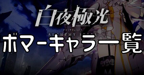 白夜極光のボマータイプのキャラ評価一覧です。レアリティ、属性ごとにボマーのキャラクターを一覧で掲載しています。白夜極光のキャラ(光霊)の評価を調べる際にご活用ください。