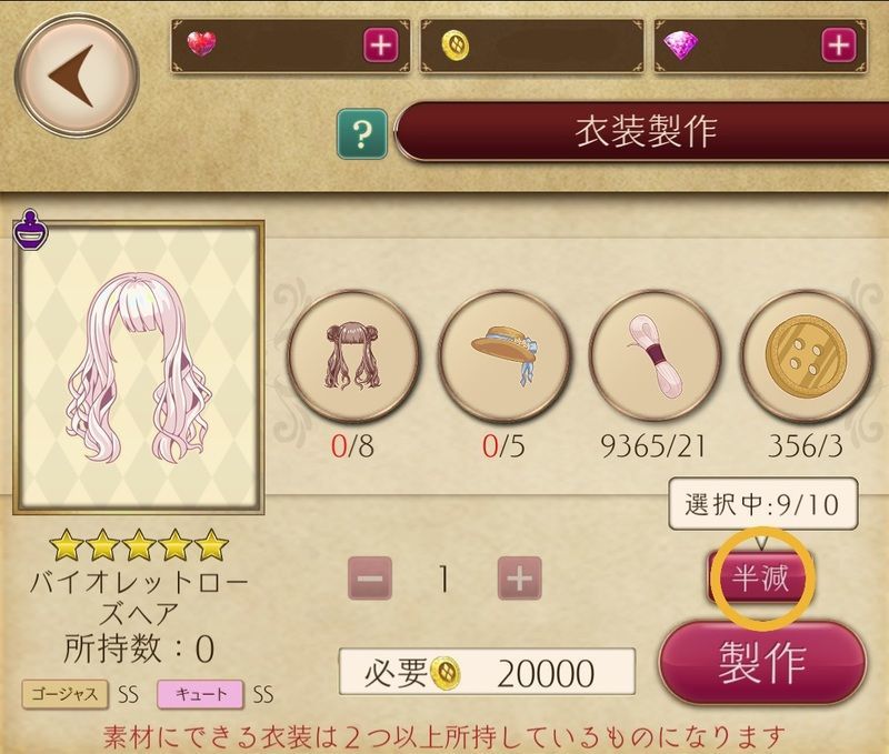 開催期間中にサポートに登録した最大10個の衣装の製作素材を半減できる機能です。