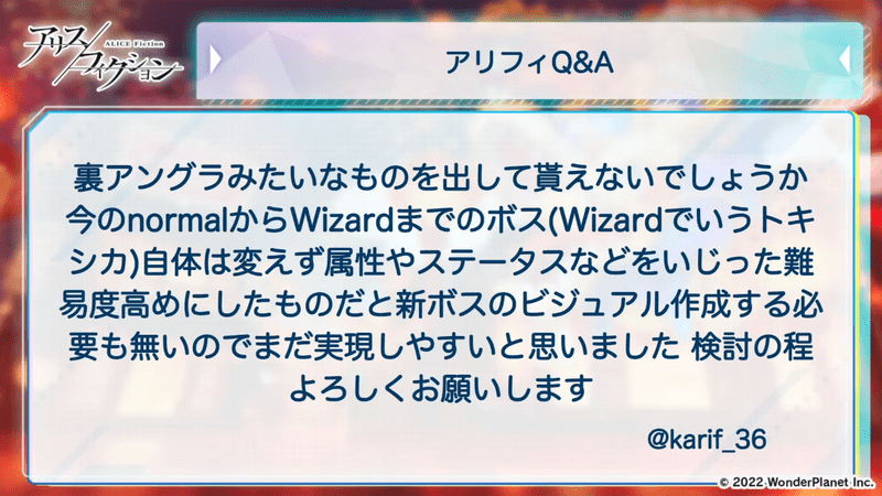 今のnormalからWizardまでのボス(Wizardでいうトキシカ)自体は変えず属性やステータスなどをいじった難易度高めにしたものだと新ボスのビジュアル作成する必要も無いのでまだ実現しやすいと思いました