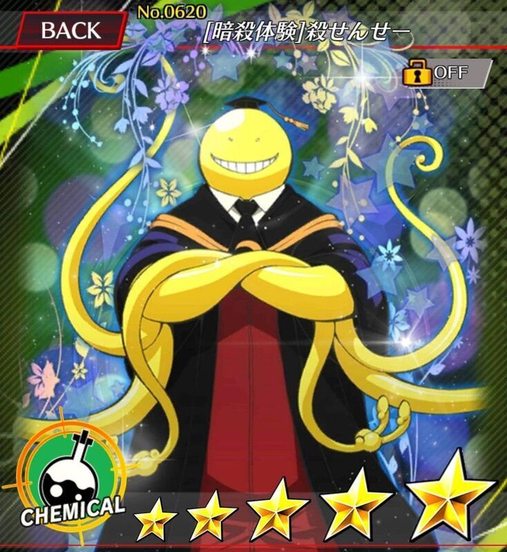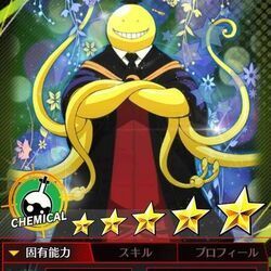 | 椚ヶ丘中学校3年E組の担任教師で、マッハ20の最高速度を誇る超生物。 甘いものが大好き。生徒達の事はもっと大好き。 「君達の挑戦。いつでも受けて立ちますよ」 | |