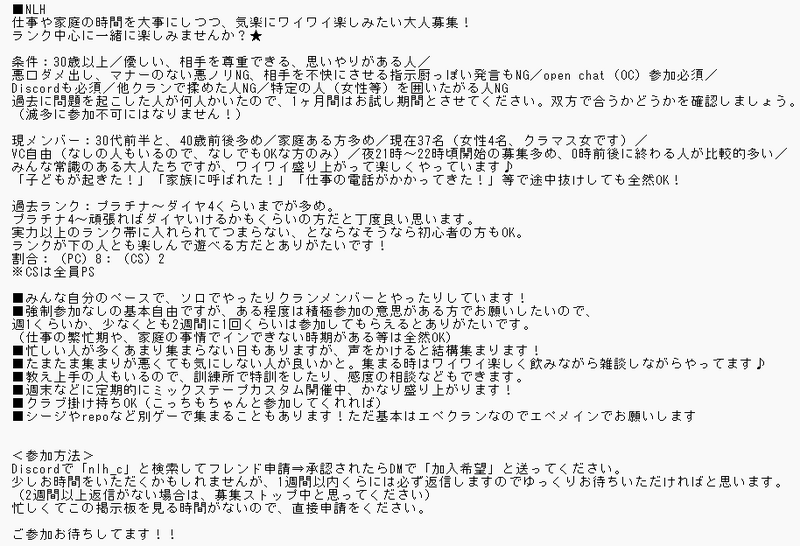 【特徴】★掛け持ちOK☆ガチのクラブではない★ランクまたはカジュアル☆ランクはプラチナまで☆小規模で同じ人とやる可能性大★CSまたはPCどちらでもOK(discord必須)