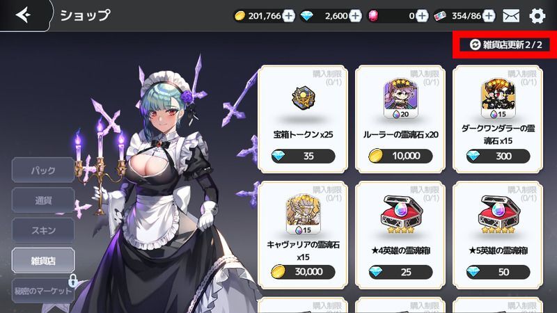 赤枠の部分を押すと1日4回まで更新することができます。(広告視聴含む)