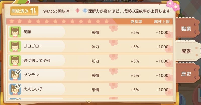 成就とは育成計画で勉強、遊びをすることによって時々成功することをいいます。成就すると能力値の横の成長率と上限が増えていきます。成長率はアバター※1で一時的に上昇させることも可能です。成就をしていかないと上限が増えていき、上限を増やしていくことでつける職業の幅も増えていきます。