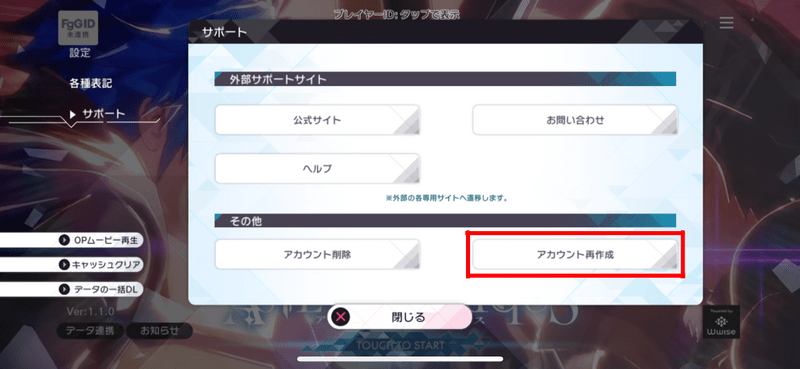 タイトル画面右上のメニュー>サポート>アカウント再作成からアカウントを作り直すことで、チュートリアルなどをスキップしてリセマラを行うことができます。