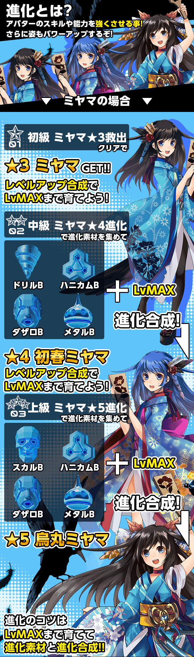 初春ミヤマ(★4)をレベルアップ合成にてLVMAXまで育て、中級、上級クエストで入手出来る進化素材