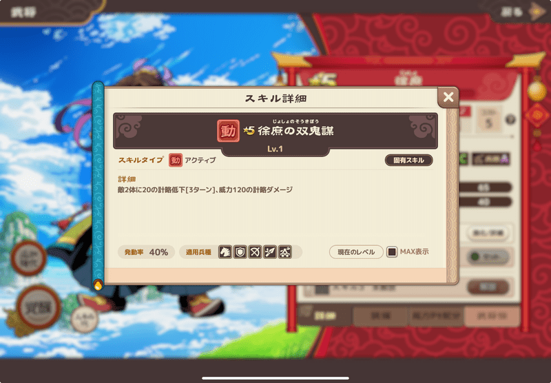 | 敵2体に20の計略低下[3ターン]、威力120の計略ダメージ |