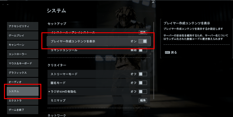 | 0 | ![]() 事前準備として設定のプレイヤー作成コンテンツを表示を「オン」に変更しておきましょう |