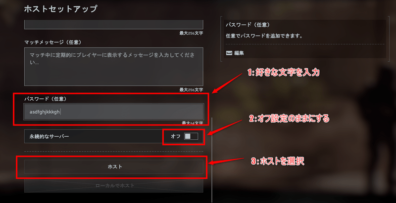 | 4 | ![]() パスワードを設定し、永続的なサーバーをオフにして、ホストをクリック |