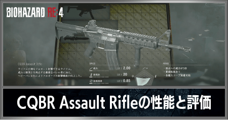 バイオハザードRE4(バイオ4リメイク)のCQBR Assault Rifle(アサルトライフル)の基本性能と評価をご紹介。威力や装填数の数値、装着可能なアタッチメント、限定解除の内容、入手方法について記載しています。