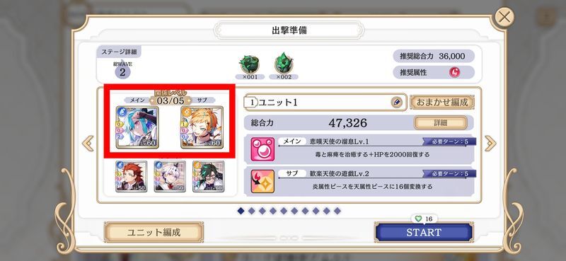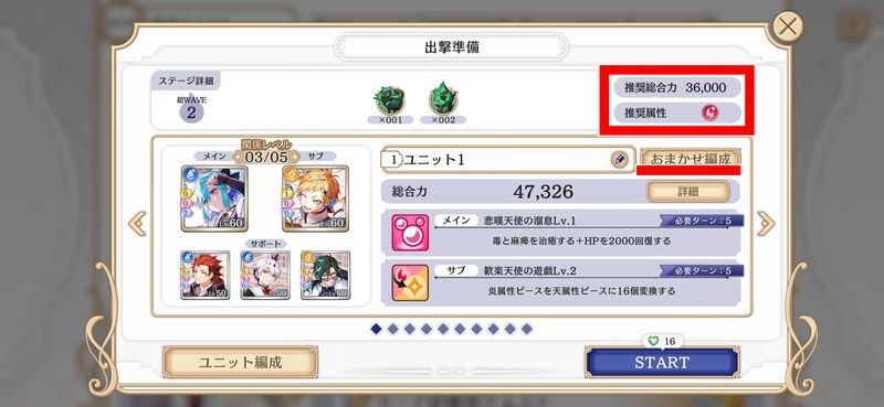 パズルはまず出撃前のステージ情報で推奨戦闘力や推奨属性を確認しましょう。なるべく敵の属性に合わせてこちらのパーティも有利属性に変更するようにしましょう。よく分からない場合は「おまかせ編成」で問題ありません。