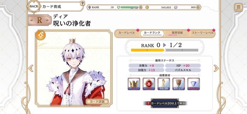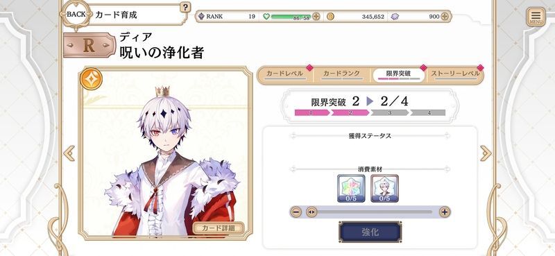 次に育成のおすすめはカードランク上げです。必要素材を一定数集めることでランクアップさせることができます。ランクアップすることでステータスやスキルレベルも上昇します。