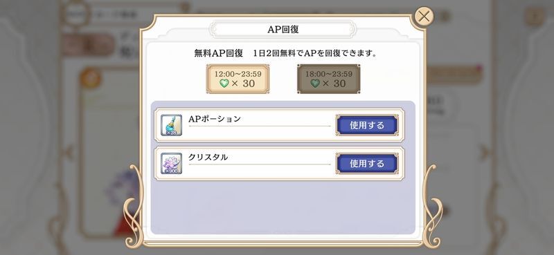 APは上限まで3分に1回復します。また1日2回12:00~と18:00~に無料で30回復できるので忘れず受け取りましょう。