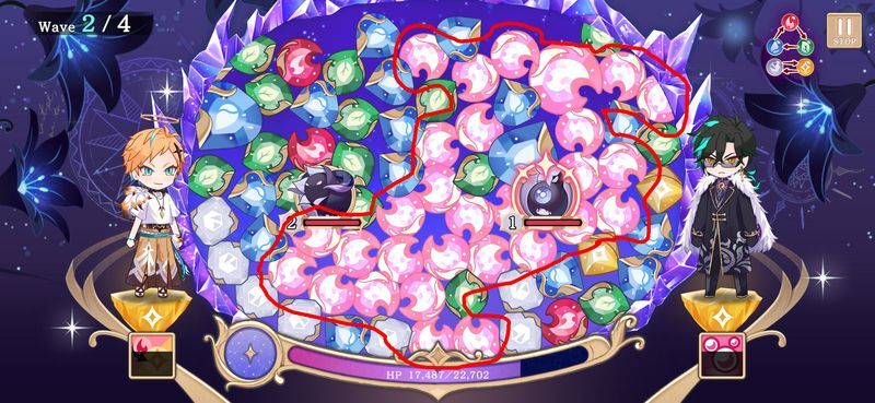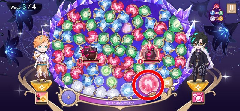 時間制限がありますが、闇雲に消すのではなく、色の塊を作ることを意識して消去しましょう。たくさん消してもチェーン数が少ないとダメージが出ません。