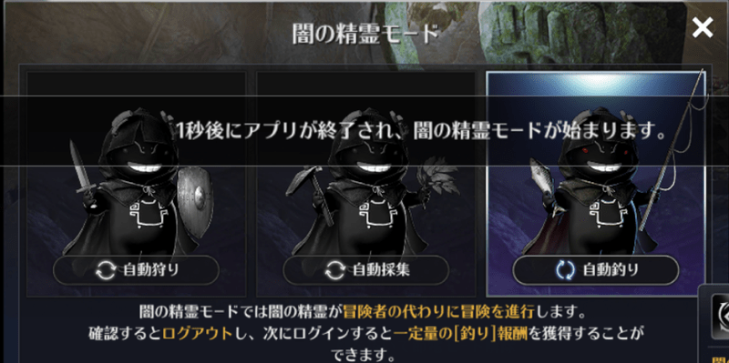 闇の精霊モードは通常の放置と違い、アプリを起動していない状態でも自動で釣りや狩りを行ってくれるので、端末で別の事をしながらでもレベル上げやアイテム収集を行うことが可能です。