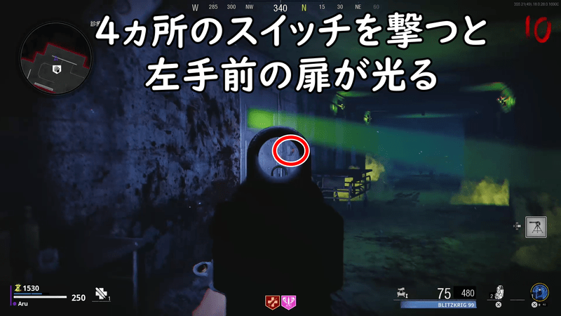 異世界に行ったら診療所に向かいましよう。バリケ外にある扉のボタン4つをパック・ア・パンチで強化した武器で撃ちましょう。成功すると扉の上の緑のランプで光ります。