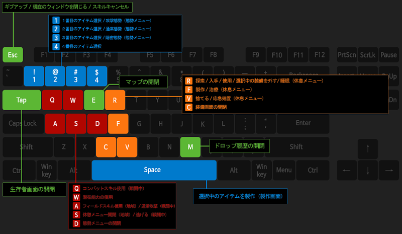 | Esc | ギブアップ、現在のウィンドウを閉じる、キャスト中のスキルキャンセル | |