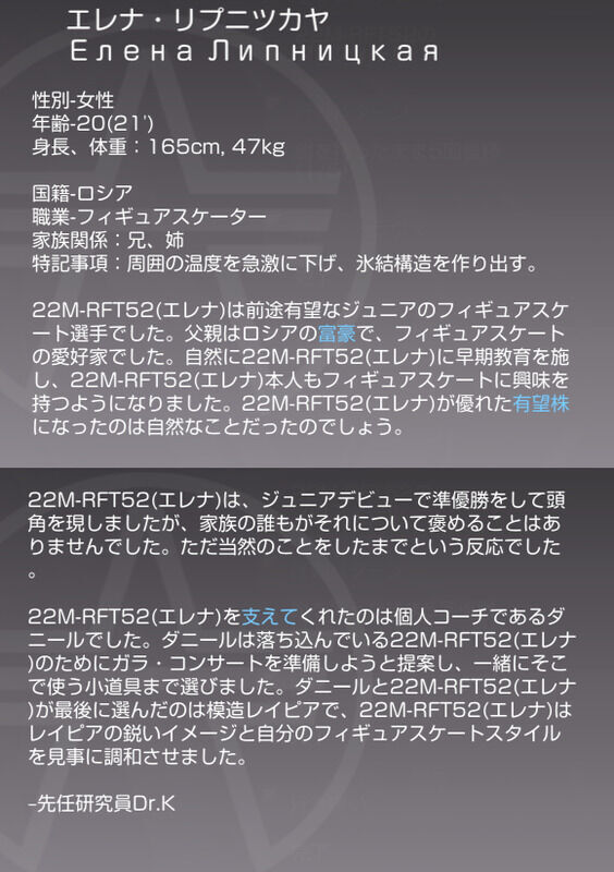 22M-RFT52(エレナ)は前途有望なジュニアのフィギュアスケート選手でした。父親はロシアの富豪で、フィギュアスケートの愛好家でした。自然に22M-RFT52(エレナ)に早期教育をさせて、22M-RFT52(エレナ)本人もフィギュアスケートに興味を持つようになりました。