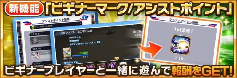 ビギナーマークを持たないプレイヤーがビギナーマークを持つプレイヤーと一緒に共闘クエストやレイドをクリアすることでアシストポイントを得ることができ、ポイントが一定に達すると、報酬を獲得できます。