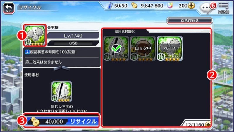 ベースアクセサリをレベルアップさせるために素材にするアクセサリを選択します。
