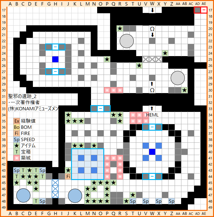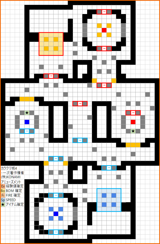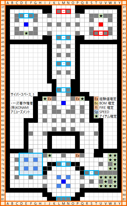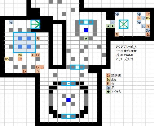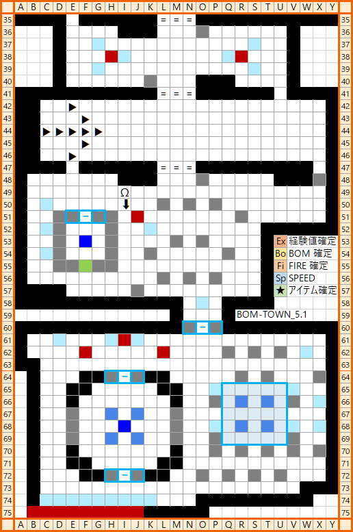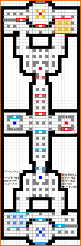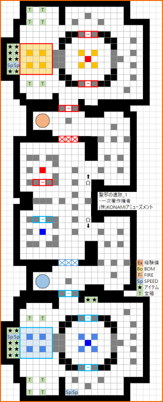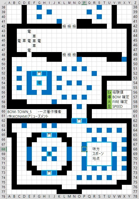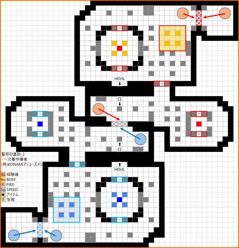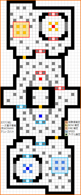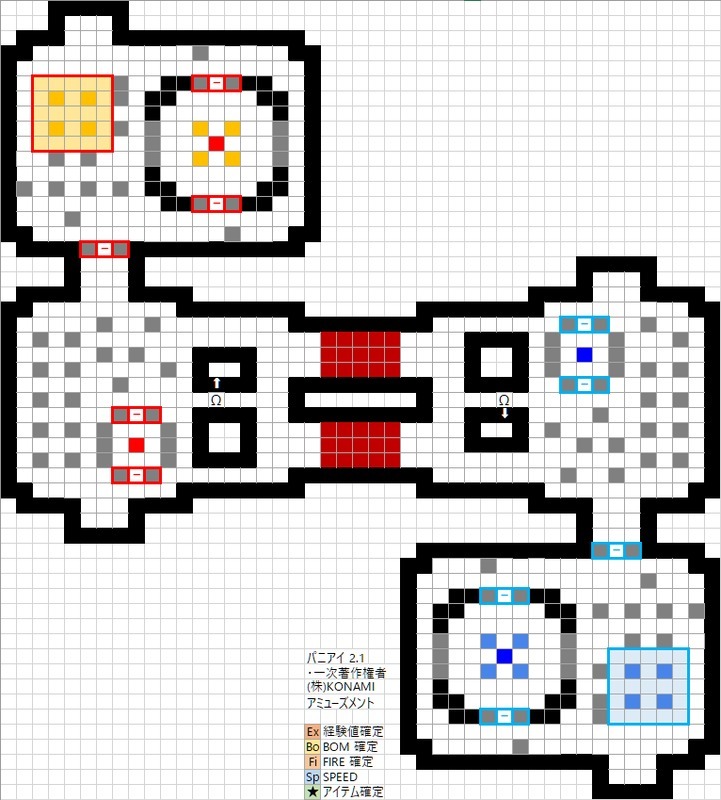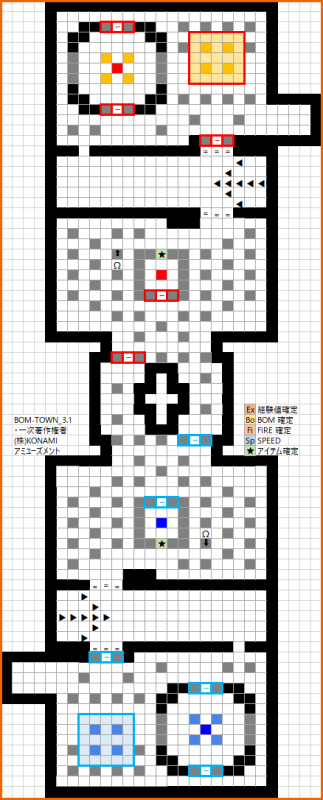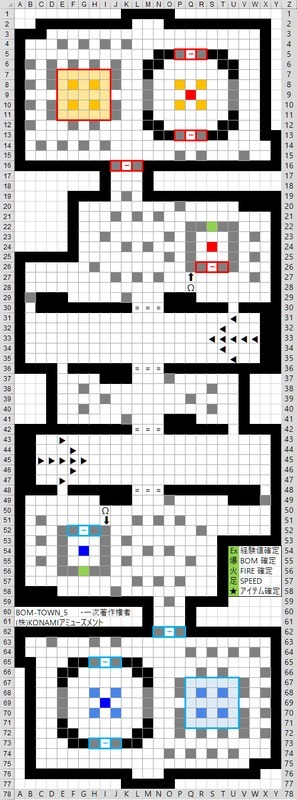 - ボムタウン3から、削除されたハードブロックの内、主なところを上のMapに赤い「―」で書いてある。