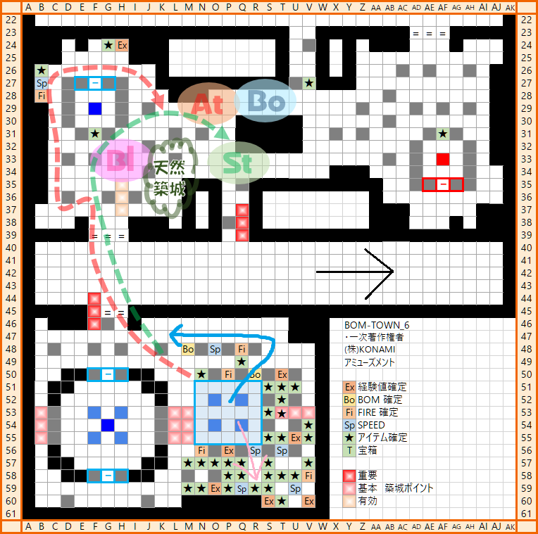 - マップの2×2マスの緑色の枠はプロテクトブロックの配置箇所。