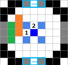 - プルーンでベース左側にコの字築城する際の一例。1回目は1の場所で緑色の所に置き、2回目は2の場所で橙色の場所に置く。
