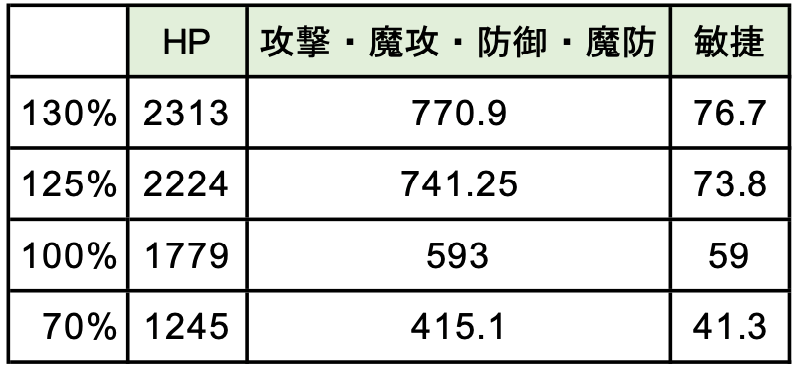 これが1メモリ分の差なので、例えば成長傾向で攻撃や魔攻が110%だった場合は130%との差はこの4倍になります。